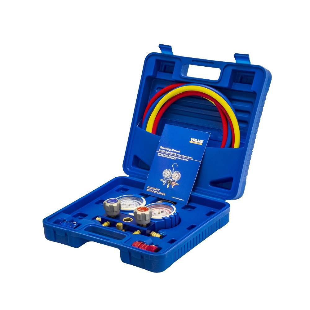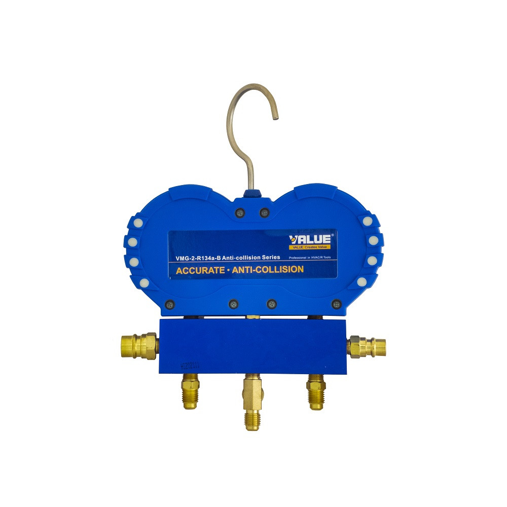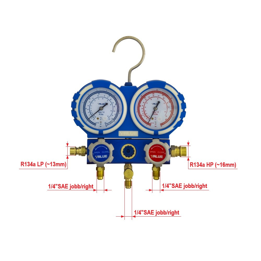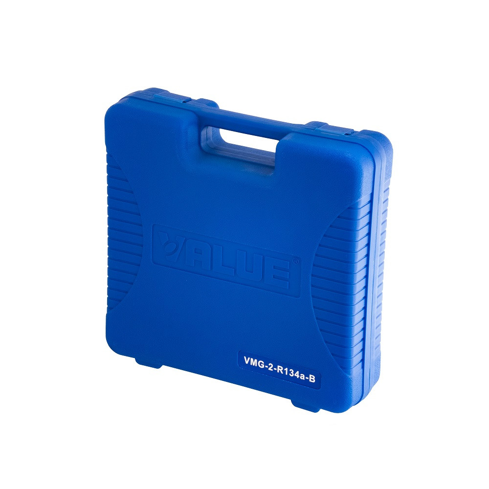 The VMG-2-R134a pressure gauge has an anodized aluminum valve body, five connection options (4x1/4", 1x5/16" SAE), sight glass, low and high pressure tap.