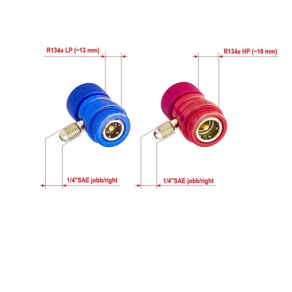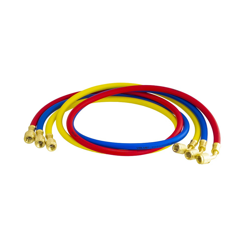 The length of the filling pipes is 120 cm, Red (1/4" - 1/4" SAE), Blue (1/4" - 1/4" SAE), Yellow (1/4" - 1/4" SAE).